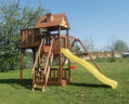 Игровой комплекс UNIX Kids – это прекрасный подарок детям. Надежная игровая конструкция для улицы изготовлена из ангарской сосны. Предназначена для детей от 3-х лет. Детская площадка предназначена для установки на загородном участке в личное пользование. Конструкция не требует бетонирования каркасных стоек, устанавливается на подготовленную поверхность и держится за счет собственного веса. Под городок требуется участок поверхности размером 375 х 370 см. Основа городка – деревянная башня высотой 265 см. На высоте 115 см установлена игровая площадка с ограждениями. Сверху башню закрывает двускатная деревянная крыша. Нижний ярус башни можно использовать под небольшую песочницу. Горка длиной 220 см изготовлена из пластика и имеет прекрасную скользящую поверхность. Боковые бортики обеспечивают безопасность малышей. Дополнительными элементами для развлечений служат скалодром, обычные подвесные качели и с гнездом размером 100 см, а так же веревочная лестница. Все элементы городка обработаны пропиткой на водной основе. Древесина надежно защищена от воздействия окружающей среды. Комплекс возможно использовать круглый год.