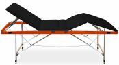 Стол имеет четыре секции с возможностью регулировки их положения. Собственный вес изделия равен всего 19 килограмм, а выдерживать стол может нагрузку до 200 килограмм. Массажный стол обладает оптимальными габаритами: 700 на 1900 мм, что обеспечивает комфортное положение клиента во время процедур. Высота складной кушетки для массажа и косметологических услуг 750 мм. У данной модели есть возможность фиксировать спинку в 10-ти разных положениях. Материалом для обивки стола служит искусственная кожа. Она отличается большим запасом прочности, не вызывает аллергии или тактильного дискомфорта. Кожзам качества люкс не теряет своей формы, не портится от механических нагрузок или попадания влаги. В качестве наполнителя для мягкой части используется плотный поролон. Он не теряет своей формы, оказывает необходимую поддержку в течение всей процедуры.
